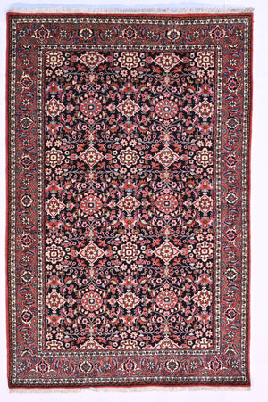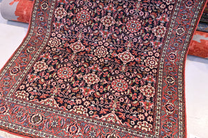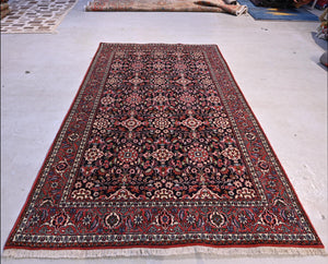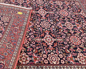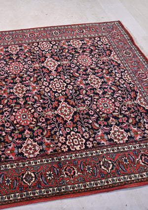 The rug here is a beautiful example of the famous Bijar rugs. The colour combination and high wool quality are typical of such carpets. However, the allover design of this carpet is rarer to find in the area where weavers are more accustomed to making the traditional Herati (also known as Mahi or fish) design.