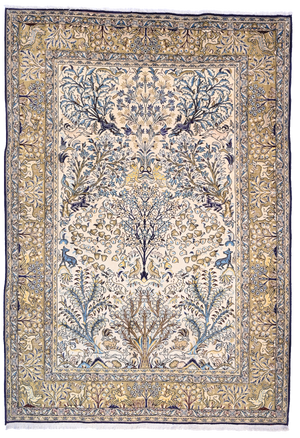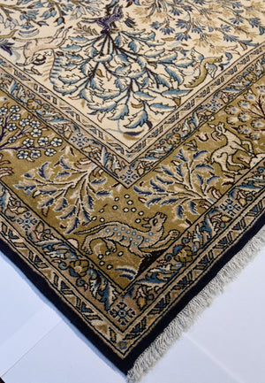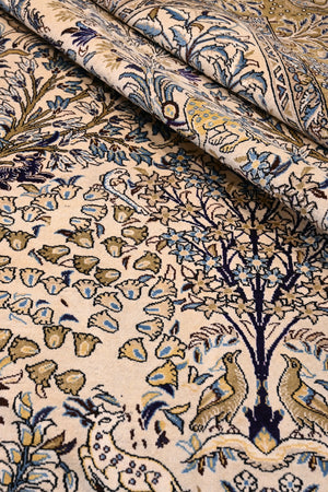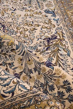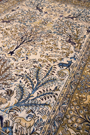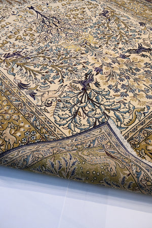Humans have always sought ways to connect with nature and bring a piece of the outdoors inside. One such way is using traditional handmade carpets like this one. The carpet is adorned with images of deer and birds, adding a unique touch to the traditional floral pattern. In full bloom, the trees on the rug represent spring's beauty and nature's abundance. The pair of animals, such as deer and birds, represent the start of new life and fertility. The carpet is made with high-quality wool and silk, creating a luxurious and durable texture. The skilful combination of wool and silk makes the carpet comfortable to walk on and easy to maintain. Using natural dyes gives the carpet a rich, pleasing colour palette. The intricate craftsmanship is evident in the attention to detail and the skilful execution of the design. This carpet is a functional piece of home decor and a collectable work of art. It will surely add a touch of elegance, cultural heritage and the beauty of nature to any room it is placed in and brings the essence of spring inside your home.