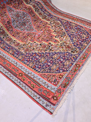 The kilim here is an excellent example of such kilims. The ladies from the villages in surrounding areas of "Sanandaj" make such pieces in their homes as a project that involves their entire household during the long nights of cold winters.